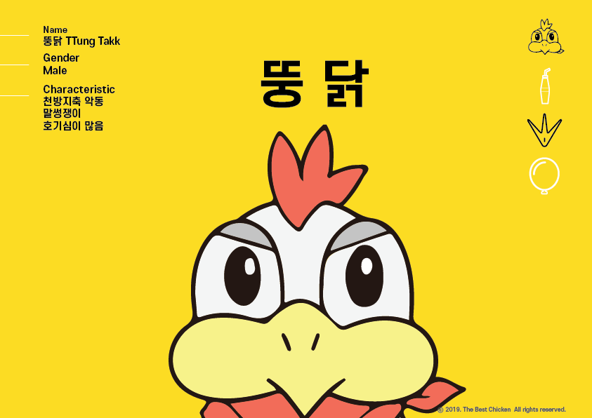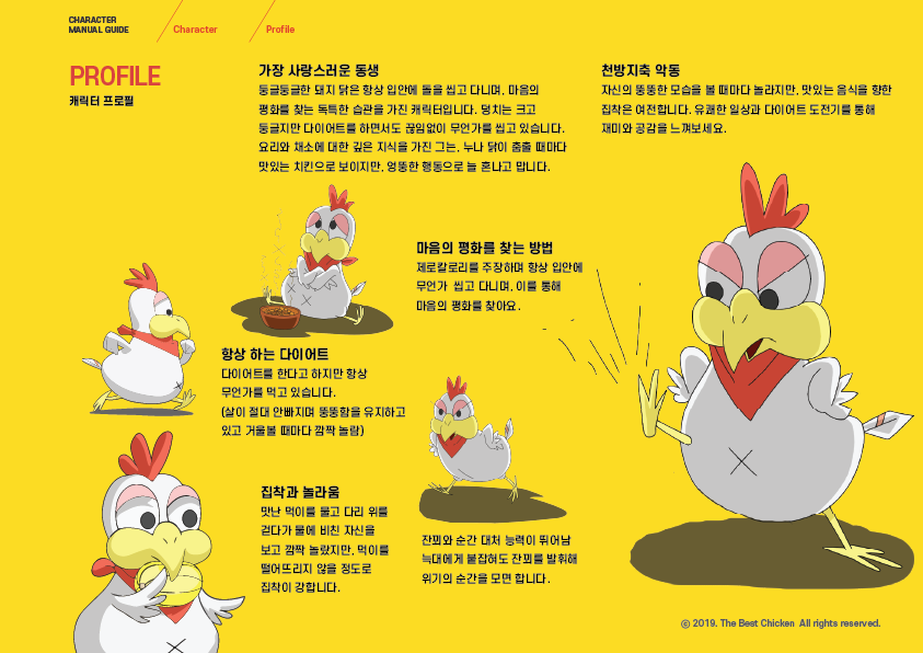 He is a round pig chicken that is twice as big as his sister. He diets hard, but he is strangely fat. This is because he hardly eats at mealtimes and always munches on something little by little. He feels peace of mind only when he chews something.